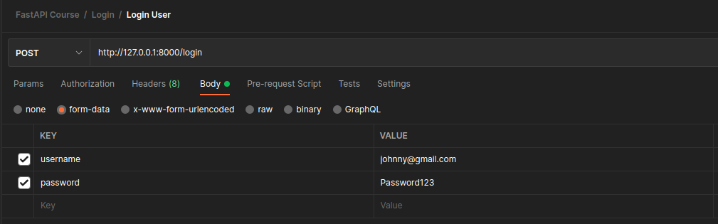 * Now that we have updated this with the OAuth2PasswordRequestForm, we no longer send the details in the body of the HTTP Request